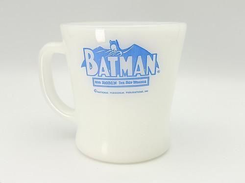 ■商品説明:ファイヤーキングの・バットマンの Dハンドルマグです。 バットマン初登場は1939年のアメリカンコミック。40年代から映像化されてきましたが、人気を決定づけたのは1966年スタートのTVシリーズ。このとき映画版も制作されています。 1989年以降も映画化されましたが、このマグはもちろん前者のもの。バックスタンプが最初に映画化された時期と一致します。 このマグのシリーズは全2種。ブルーのバットマンとレッドのロビン。
