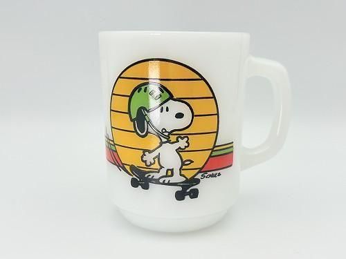ファイヤーキングのスヌーピーマグ「スケートボード」 です。 4種類あるスポーツシリーズのひとつです。あぶなっかしくスケボーにのってるスヌーピーがとてもキュート。 とにかく人気のあるマグです!!